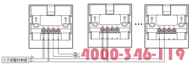 “S+”、“S-”為總線端子,接入火災報警控制器;“T+”、“T-”為對講電話接線端子,可根據需要接入消防電話主機。